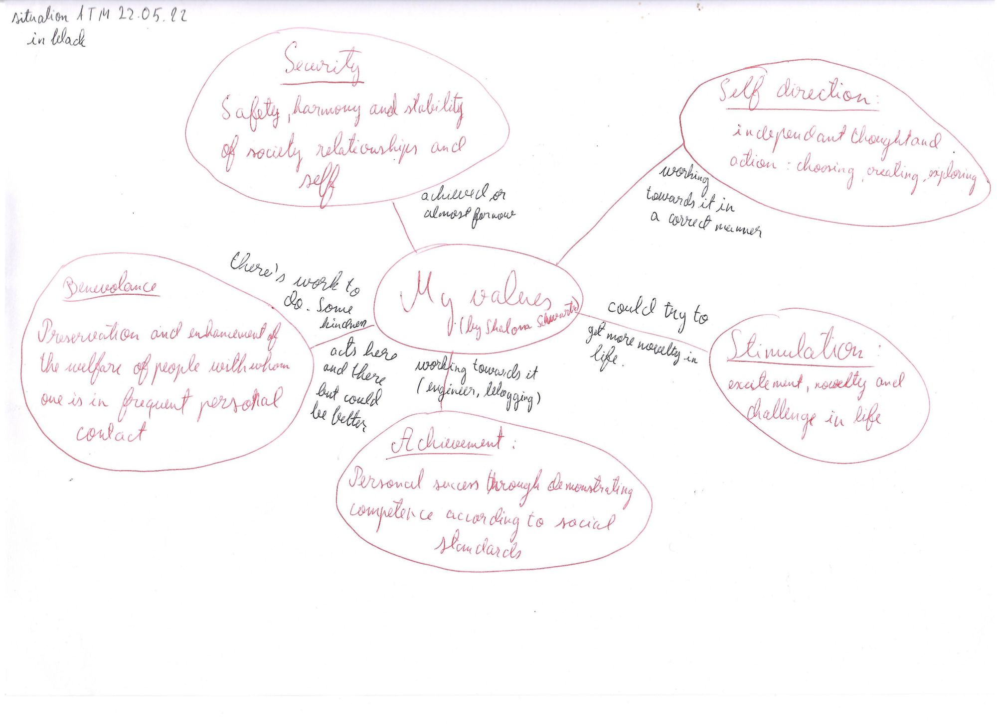 This intertwining of my knowledge inspired me way more and I went on to make a mind map with my own values (or at least what I believe them to be at the moment). I also added small notes on wether I was thriving in a certain field or if there was work to be done. Without further ado I will share with you Shalom Schwartz's findings so that You can do the same.