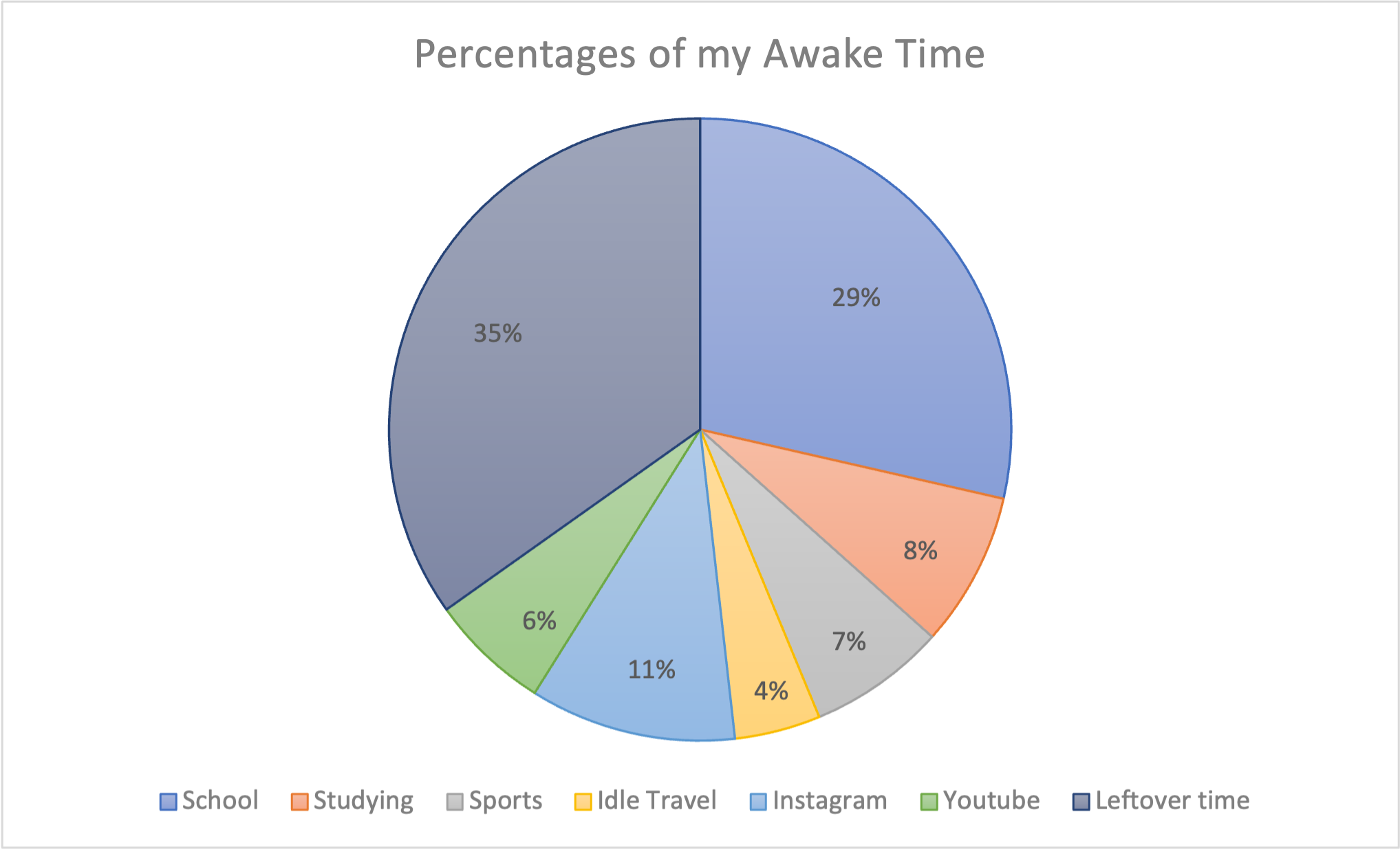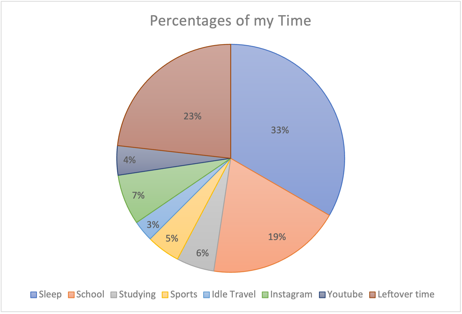 I would argue that a rather big percentage of the leftover time is spent on social interactions and hobbies. This being said I have not documented that time so I can not say that as a fact. Anyway, based on this week's stats I decided to play around with excel and make pie charts.